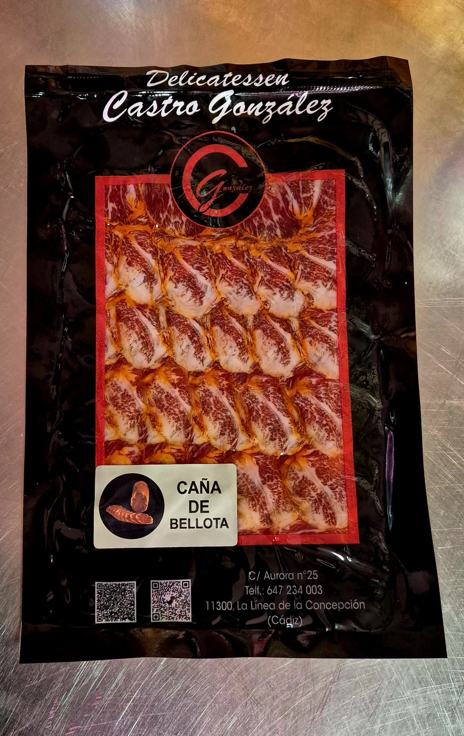 Caña Ibérica de bellota loncheada y emplatada al vacío.